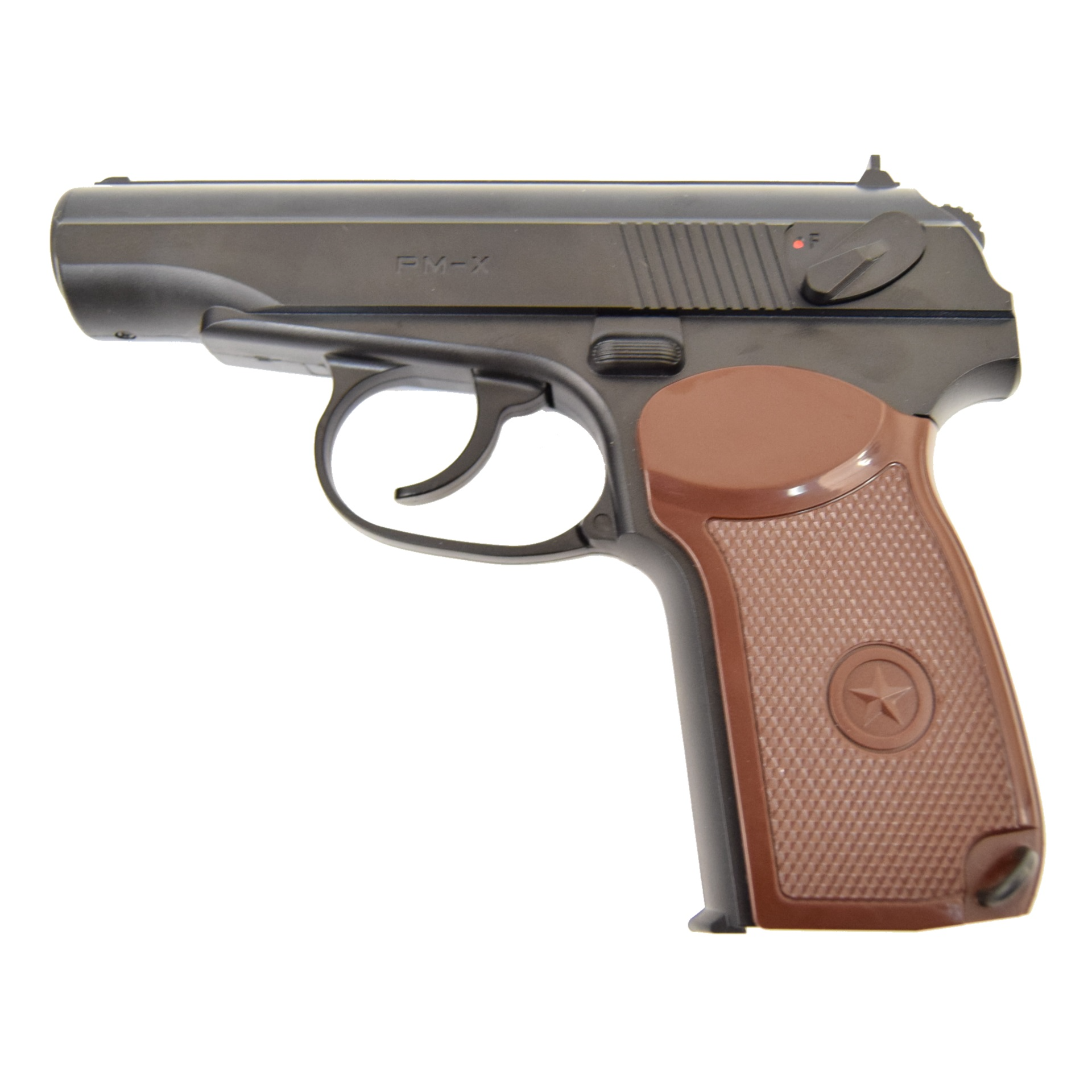 ПМ-Х выполнен из пластика. Это делает его очень легким, но менее реалистичным. Но скоростные показатели у него выше среднего. Средняя скорость выстрела на новом баллоне составляет около 130 м/с.